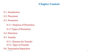 Chapter eight of the document discusses promotions, transfers, and separations in human resource management, detailing the processes and reasons for each type of employee movement. It covers concepts such as placement, types of promotions (horizontal, vertical, and dry), reasons for transfers, and various forms of termination including layoffs, resignations, and retirements. The chapter emphasizes the importance of aligning employee roles with organizational needs and managing workforce changes effectively.