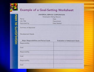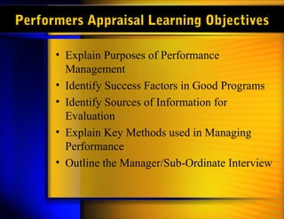 This document discusses performance appraisals and managing employee performance. It outlines several key purposes of performance appraisals including providing feedback to employees, documenting performance, making compensation and promotion decisions, and setting goals. It also discusses different methods for conducting performance appraisals such as rating scales, essays, management by objectives, and critical incidents. Common errors in performance ratings like leniency, central tendency, and recency are also examined. The document provides guidance on conducting effective performance appraisal interviews.