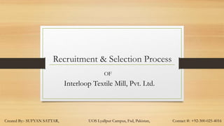 The document summarizes the recruitment and selection process at Interloop Textile Mill. It discusses the various stages including recruitment both internally and externally, the selection process involving application forms, references, tests and interviews. It also outlines the orientation and training provided to new employees to help them adjust and develop their skills. The performance management and career development processes are also summarized.