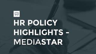 The document outlines MediaStar's HR policies and processes, including structured governance, workforce planning, flexible organization design, and measuring both operational and business metrics. It describes the hiring process, onboarding, transfers, training methods, and barriers to effective training. Key highlights include requirements for approving bonuses, loans, and benefits. The employee safety policy prohibits gender bias and sexual harassment.
