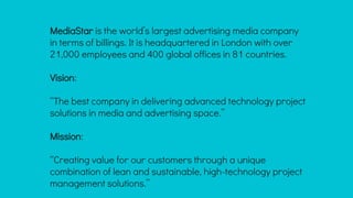 MediaStar is the world's largest advertising media company with over 21,000 employees in 400 offices across 81 countries. Its vision is to be the best company delivering advanced technology project solutions in media and advertising, and its mission is to create value for customers through lean, sustainable high-technology project management solutions.