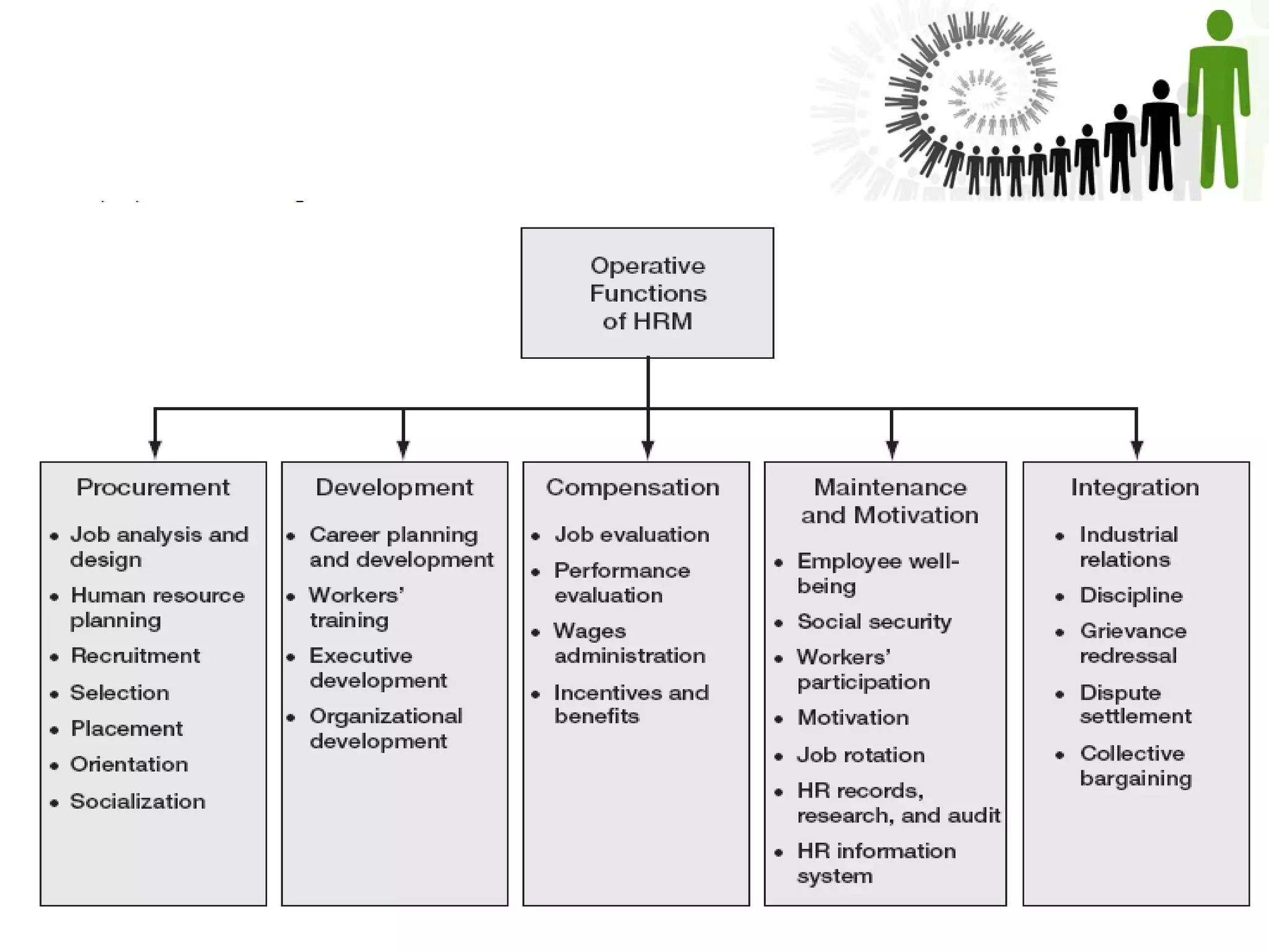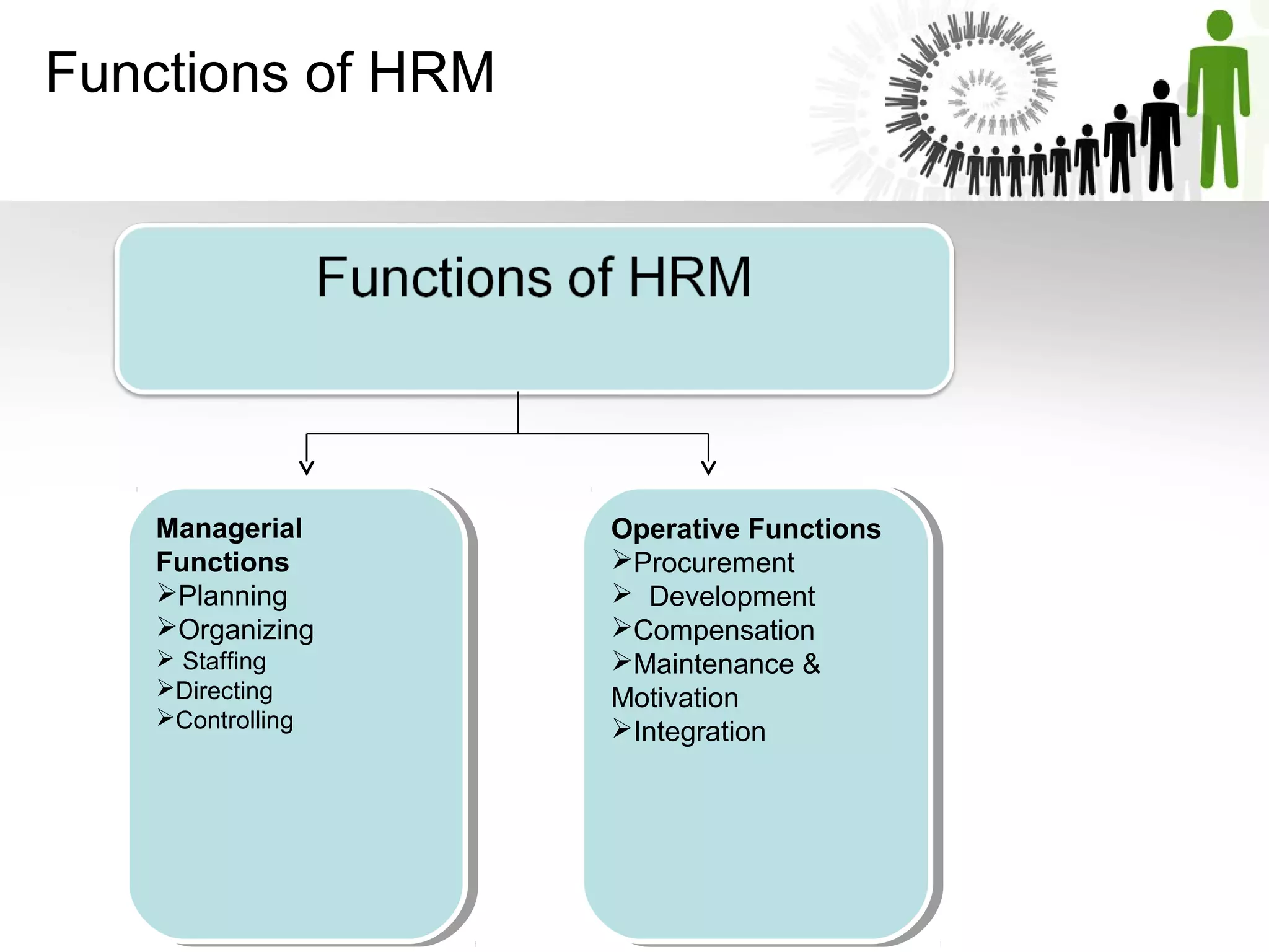 Human resource management functions can be divided into managerial functions and operative functions. The managerial functions include planning, organizing, staffing, directing, and controlling. The operative functions involve procurement, development, compensation, maintenance and motivation, and integration. Procurement deals with activities like recruitment, selection, and placement. Development refers to training programs. Compensation determines pay scales and benefits. Maintenance aims to ensure a safe and healthy work environment. Integration works to align employee and organizational goals through programs like grievance resolution.