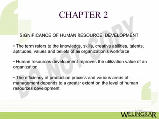 Chapter 2 of the document focuses on Human Resource Development (HRD), emphasizing its significance in enhancing the workforce's skills, knowledge, and competencies to adapt to changing organizational environments. It highlights the systematic, continuous, and multi-disciplinary nature of HRD, detailing its objectives, functions, techniques, and the expected outcomes for individuals, organizations, and society. The chapter also discusses the attributes required for HRD managers to effectively foster employee development and organizational growth.