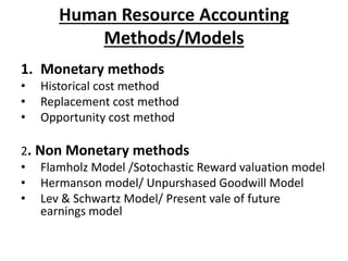 Human Resource Accounting (HRA) involves identifying, measuring, and communicating data about human resources, focusing on costs related to recruitment, training, and their economic contributions to profitability. Methods of HRA include monetary approaches like historical cost, replacement cost, and opportunity cost, as well as non-monetary models like Flamholz's stochastic model and Hermanson's model. Additionally, psychological contracts define the relationship between employers and employees, encompassing mutual expectations and can be categorized into transactional and relational contracts.