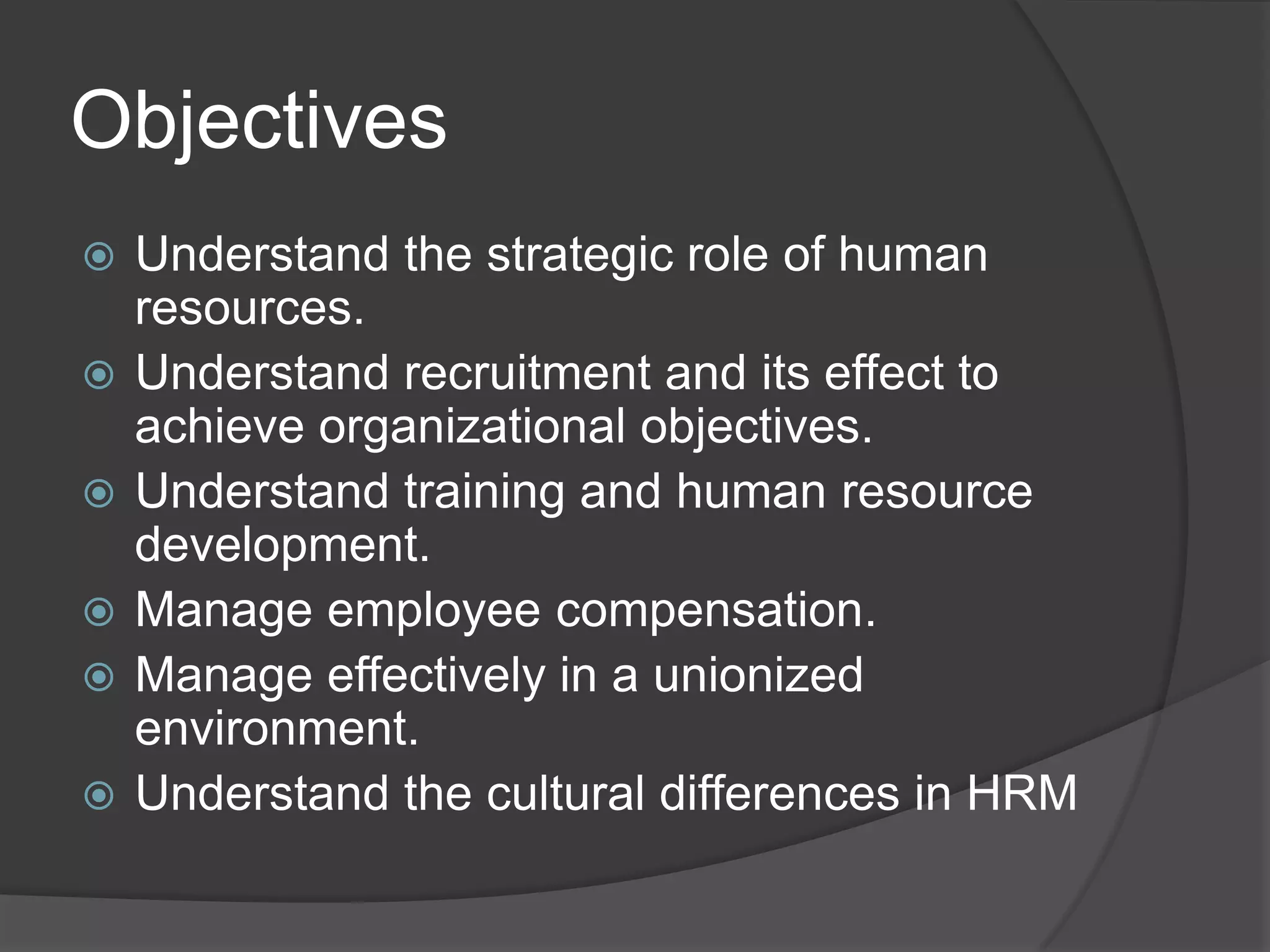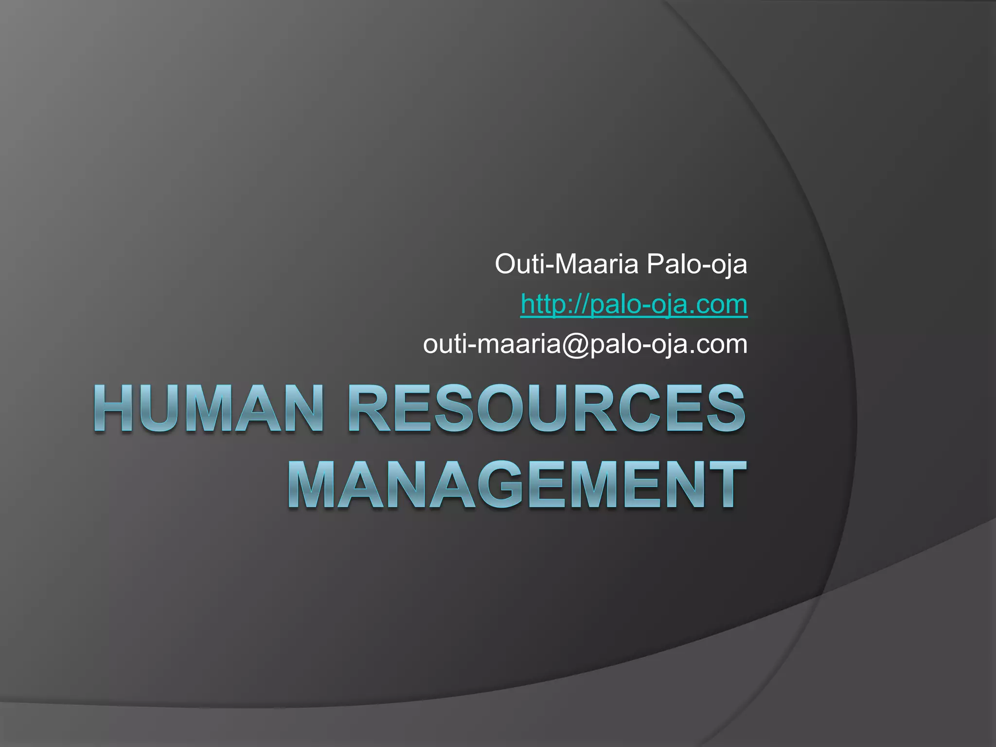 This document outlines an online course on human resources management. The objectives of the course are to understand the strategic role of HR, recruitment and its effect on organizational objectives, and training and human resource development. Students will develop skills in formulating HR strategies, critical thinking, communication, and group work. Course material will be provided online, and additional materials can be found online and in the library. Students will participate in class discussions, complete two group projects, and take a final exam to earn a total of 100 points for the course. The course consists of seven 90-minute lessons held between March and May, with self-study required between lessons. Exams can be taken on three scheduled dates in April, May, and June.