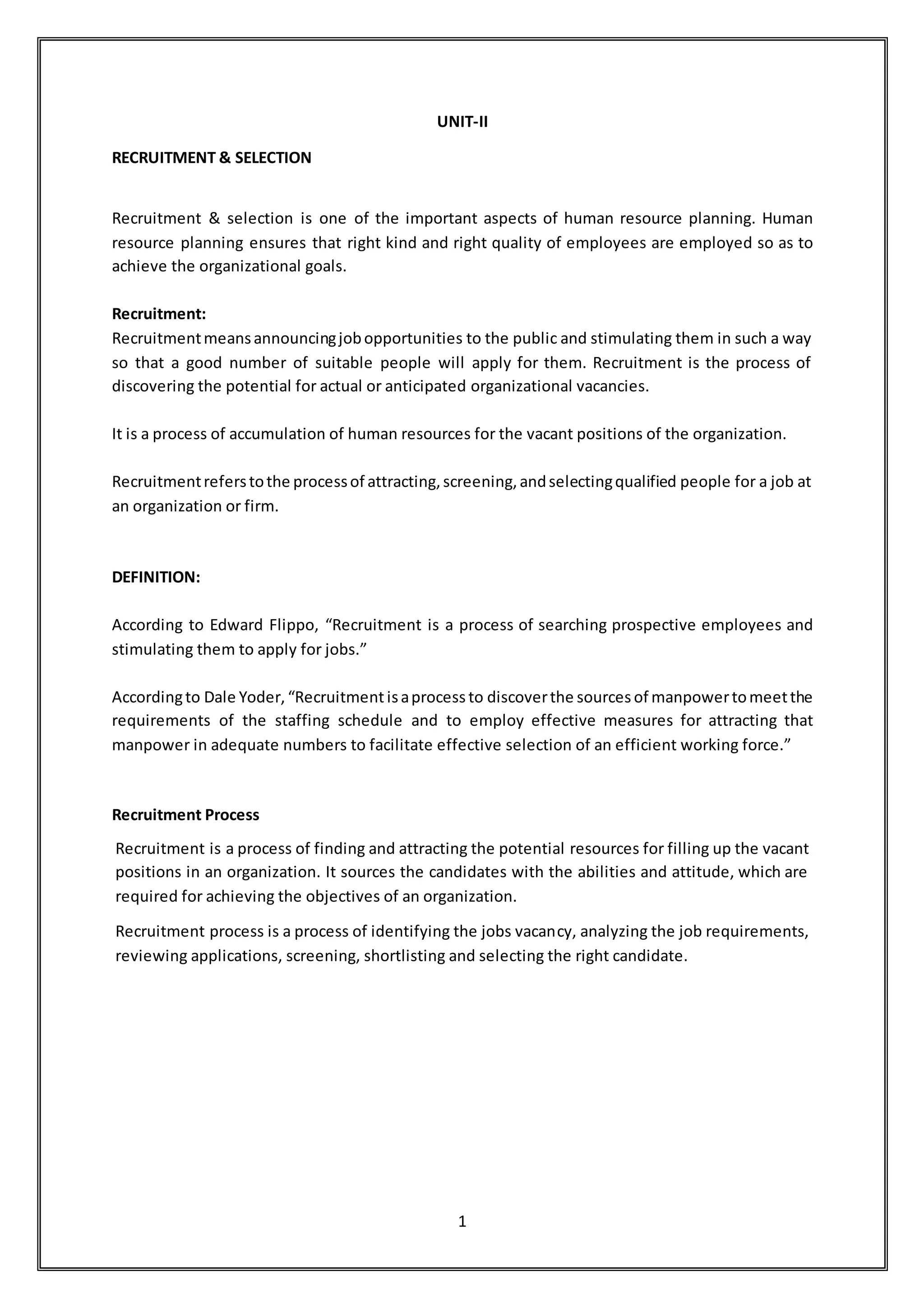 This document discusses the recruitment and selection process. It begins by defining recruitment as announcing job opportunities to attract suitable applicants. The recruitment process involves identifying vacancies, analyzing job requirements, reviewing applications, screening candidates, and selecting the right candidate. Key aspects of the recruitment process discussed include recruitment planning, developing a recruitment strategy, searching for candidates through internal and external sources, and screening and shortlisting candidates.