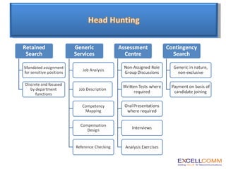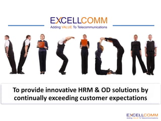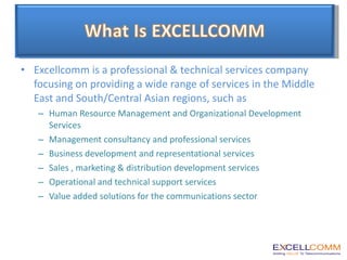 Excellcomm is a professional services company providing human resource management, organizational development, and other services in the Middle East and Central Asia regions. Their HR services include consulting, surveys, developing HR policies and procedures, training and development programs, payroll services, and head hunting. They aim to provide strategic and tangible benefits to clients through customized and interactive consulting solutions.