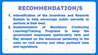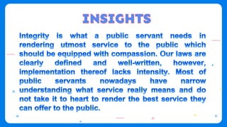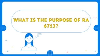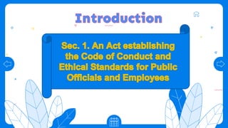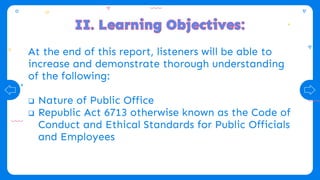The document discusses the nature of public office and the Code of Conduct and Ethical Standards for Public Officials and Employees (Republic Act 6713). It defines key terms like public office, public officer, gift, and conflict of interest. It outlines the norms of conduct, duties, and prohibited acts for public officials according to the Code. It also discusses the requirements for financial disclosure statements and penalties for violations of the Code, which include fines, suspension, removal from office, and imprisonment. The goal of the Code is to uphold the principle that public office is a public trust.