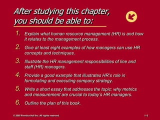 The document discusses the strategic role of human resource management. It explains that HR involves carrying out policies and practices related to recruiting, training, rewarding, and evaluating employees. The responsibilities of HR include both line managers who directly oversee employees and staff managers who assist and advise line managers. An effective HR department formulates strategy with top management and uses metrics to demonstrate how HR activities achieve strategic goals and business outcomes. The role of HR is evolving to focus more on business objectives and demonstrating return on investment through metrics like turnover and training costs.