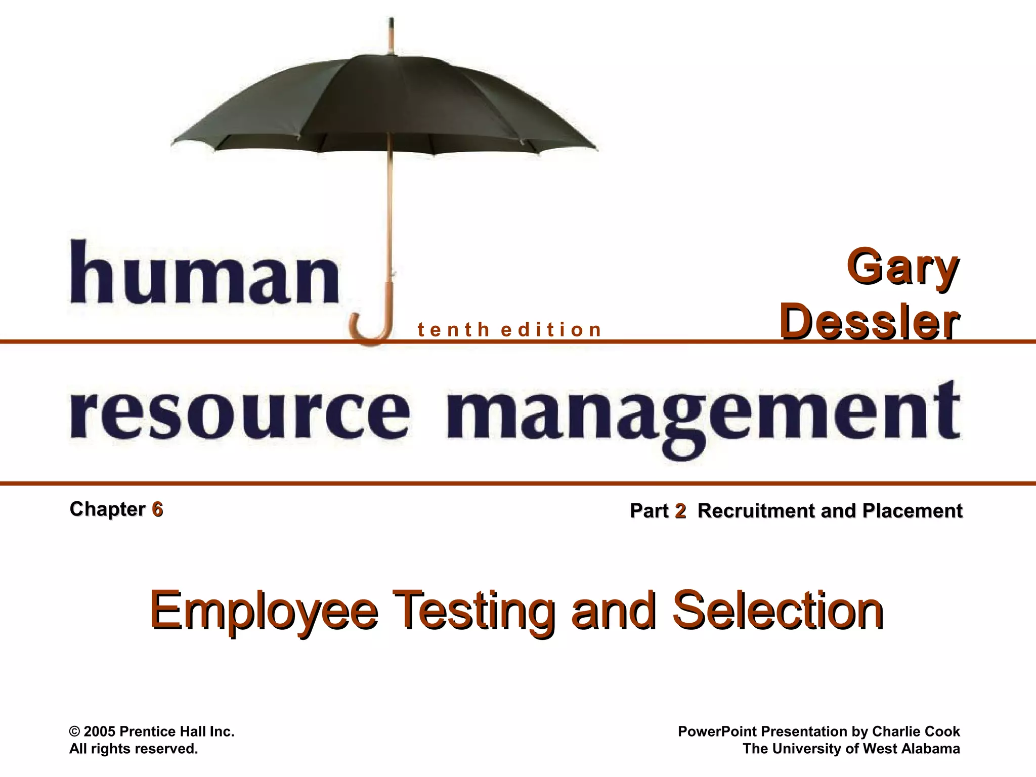 The document provides an overview of employee testing and selection. It discusses the importance of careful selection, concepts of reliability and validity in testing, guidelines for validating tests, common types of tests used in selection like personality and skills tests, the legal and ethical considerations of testing, and how to conduct background investigations and reference checks. The document contains examples, figures, and tables to illustrate key points.