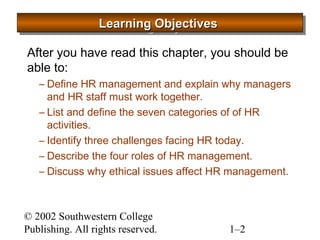 This document provides an overview of human resource management. It defines HR management and discusses the changing nature of the field. It also outlines seven categories of HR activities, identifies challenges facing HR today, and describes the four common roles of HR management, which include administrative, employee advocate, operational, and strategic roles. Finally, it discusses the importance of ethics in HR management.