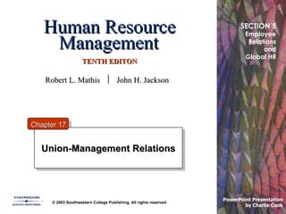 This document discusses employee relations and global human resources, focusing on unions and their role in the workplace. It covers the definition of unions, reasons for declining membership, the national labor code, and the unionization process alongside collective bargaining. The content also highlights important legal frameworks, stages of grievance procedures, and various types of strikes.