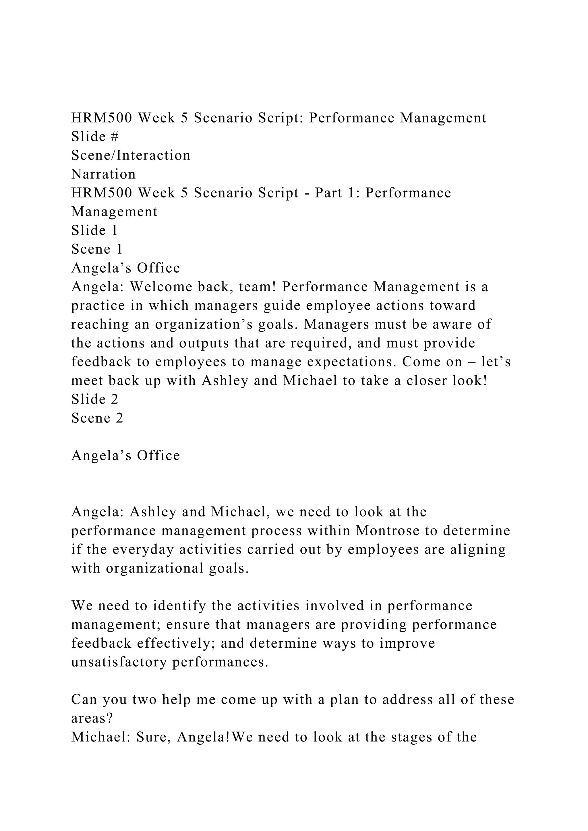 The document outlines a performance management scenario involving managers Angela, Ashley, and Michael, who discuss aligning employee actions with organizational goals through effective performance management processes. They highlight the three primary purposes of performance management: administrative, developmental, and strategic, while also discussing criteria for effective systems and comparing management by objectives (MBO) and total quality management (TQM) systems. The importance of regular and constructive feedback to address performance deficiencies is emphasized, as well as the value of collaboration between management and employees in goal setting and assessing performance.