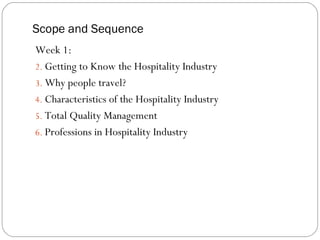 This document provides an overview of hospitality operations management, including the scope and sequence of topics covered in Chapter 1. It discusses the interrelated nature of hospitality and tourism industries and various career paths within lodging, restaurants, recreation, events, and other sectors. It also covers why people travel, characteristics of the industry, total quality management, trends impacting the field, and concludes that now is a good time to join the growing hospitality industry as many management roles are needed.