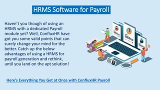 The document promotes ConfluxHR's HRMS software, highlighting its advantages for payroll management, such as improved accuracy, cost savings, time efficiency, convenience, automated payslips, and enhanced data security. It emphasizes the transition from manual payroll processing to an automated system that simplifies tasks and reduces errors. The document encourages organizations to reconsider their payroll processes and contact ConfluxHR for solutions.