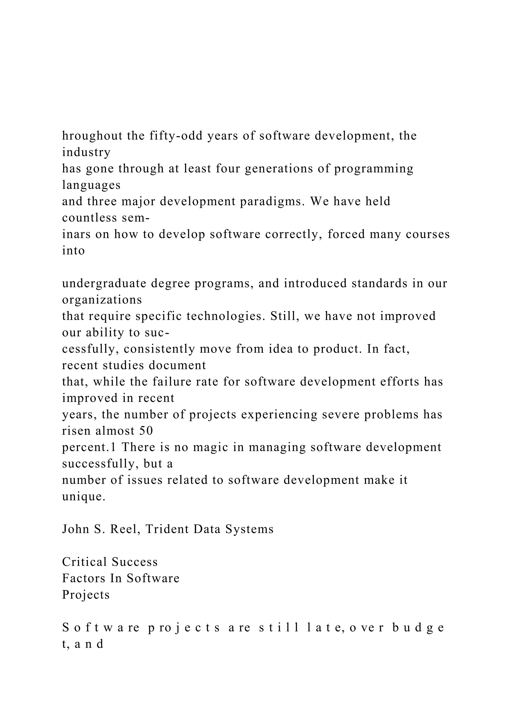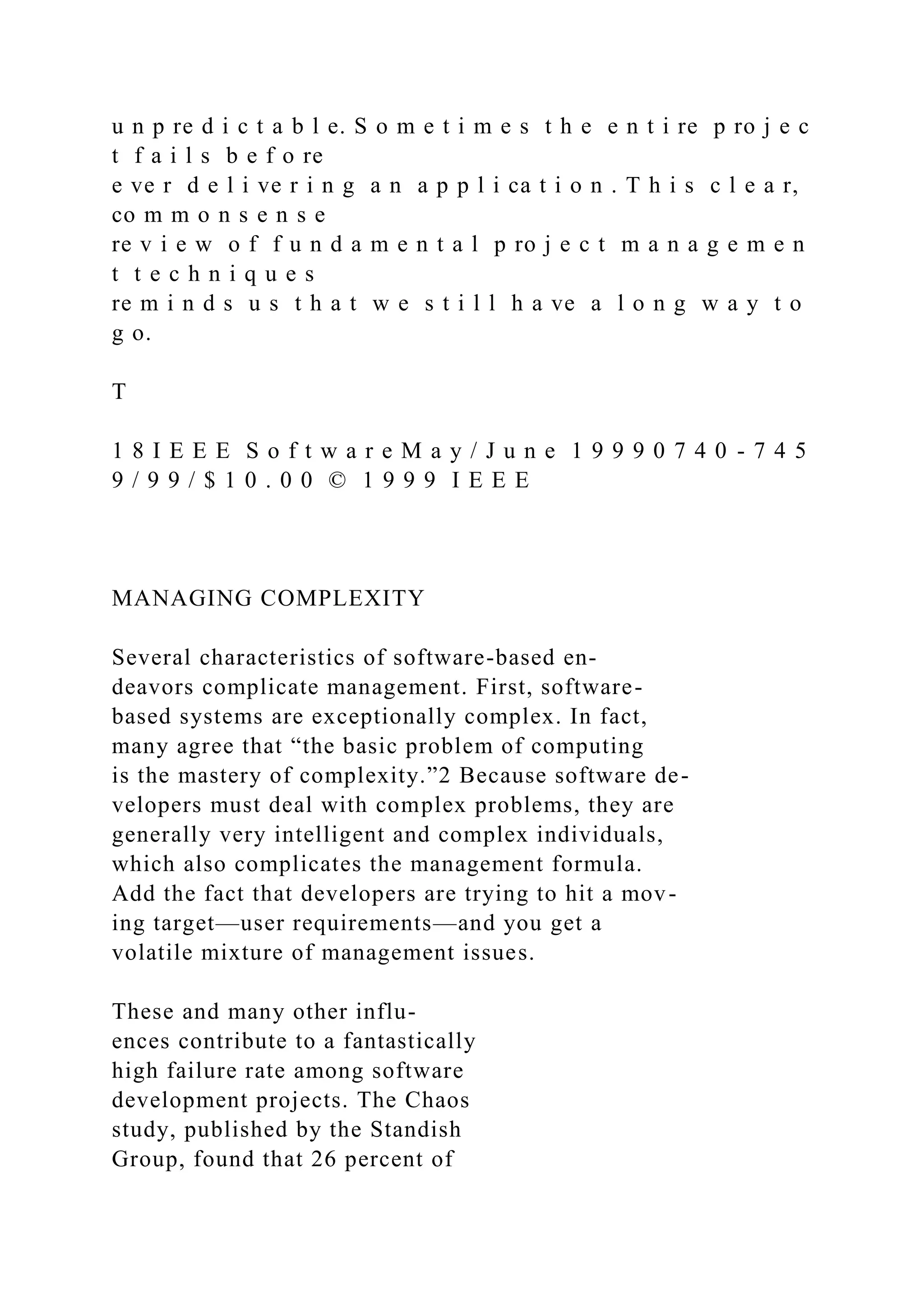 The document discusses the persistent challenges in software development, highlighting high failure rates and common issues like unclear project scopes and unrealistic expectations. It emphasizes the importance of foundational management principles, such as starting projects correctly, maintaining momentum, tracking progress, making informed decisions, and conducting post-mortem analyses to reduce failure rates. Ultimately, it argues that successful software management relies more on basic principles rather than advanced technologies or methodologies.