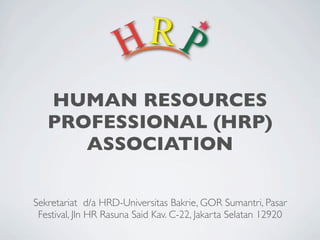 Dokumen ini membahas tentang Asosiasi Profesional Sumber Daya Manusia (HRP) yang bertujuan untuk menjadi wadah bagi pengelola sumber daya manusia dan berperan aktif dalam pengembangan sumber daya manusia di berbagai industri. HRP menawarkan program-program seperti pembentukan asosiasi HRP, pusat informasi sumber daya manusia, sertifikasi manajemen sumber daya manusia, dan fasilitasi kolaborasi antar anggota