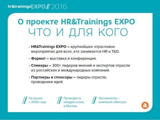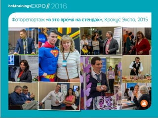 Документ содержит информацию о мероприятиях HR&Trainings Expo, которые состоятся в 2016 и 2017 годах в Москве и Казани, с планами на выставки и конференции. В нем представлено более 160 экспонентов, 80 выступлений и возможности для заранее назначенных встреч. Также упоминаются новые функции, такие как сортировка экспонентов и номинация 'лучший стенд', а также контактные данные организаторов.