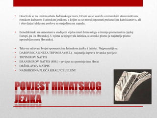 Hrvati su se na istočnu obalu Jadranskoga mora susreli s rimskom kulturom i latinskim jezikom, što je utjecalo na razvoj hrvatskog jezika kroz pismenost širenih benediktinskim samostanima. Tijekom povijesti, koristili su različita pisma poput latinice, glagoljice i ćirilice, a najznačajniji spomenici uključuju Bašćansku ploču i prvu tiskanu knjigu, misal iz 1483. godine. Razvoj hrvatske književnosti rezultirao je istaknutim autorima poput Marka Marulića te se nastavilo unatoč povijesnim previranjima koja su utjecala na jezično stanje u zemlji.