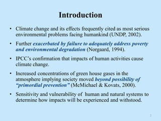 Climate change poses serious threats to humanity and the environment. Increased greenhouse gas concentrations from human activities are causing the planet to warm beyond natural variability. This document discusses the science of climate change, its causes, impacts such as sea level rise and effects on ecosystems, food security, water supply and public health. It also covers climate change policies and conferences, as well as social and economic dimensions of the issue.