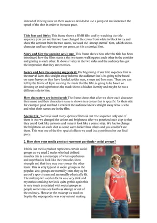 - The document is a student's analysis of their film title sequence, discussing elements like the title, setting, costumes, camerawork, editing, story, genre, character introductions, and special effects.