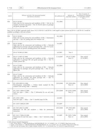 This document lists harmonized standards for lifts that have been published in the Official Journal of the European Union. It provides the reference and title of each standard, the European Standards Organization (ESO) that published it, the date of its first publication in the OJ, and any superseded standards and dates when presumption of conformity of the superseded standards ceases. The standards provide safety rules for construction, installation, maintenance and testing of lifts and escalators.