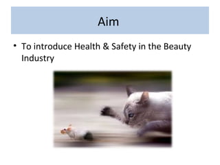 This document provides an introduction to a Health & Safety Week training. It outlines the aims of introducing Health & Safety in the beauty industry and lists objectives around identifying hazards and risks in the workplace. It instructs participants to create mind maps of what they already know about health and safety legislation and hazards in a salon. It also defines hazards as situations that may cause harm and risks as the chance of harm from a hazard.
