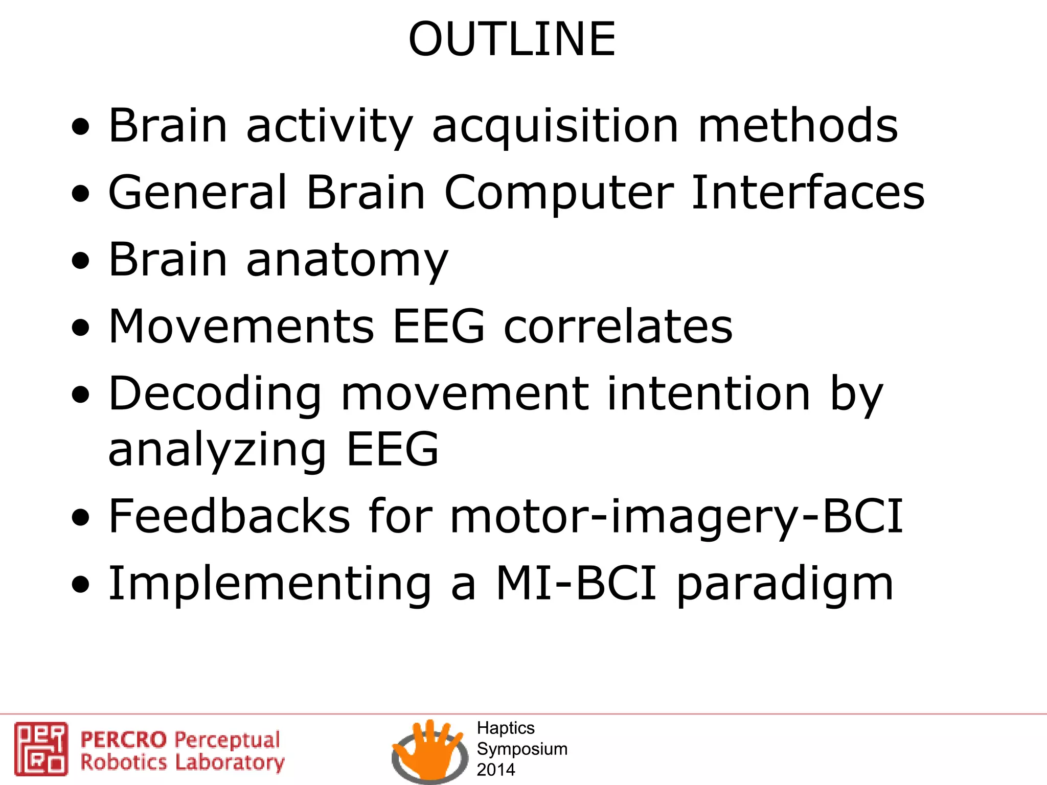 The document outlines a presentation on using brain-computer interfaces (BCIs) for upper limb neurorehabilitation. It discusses acquiring brain activity signals using electroencephalography (EEG), features of EEG signals, brain anatomy related to movement, motor imagery as a mental strategy for BCIs, and decoding movement intentions from EEG data analysis of event-related potentials and spectral perturbations. The goal is to control an exoskeleton through motor imagery-based BCI for rehabilitation applications.