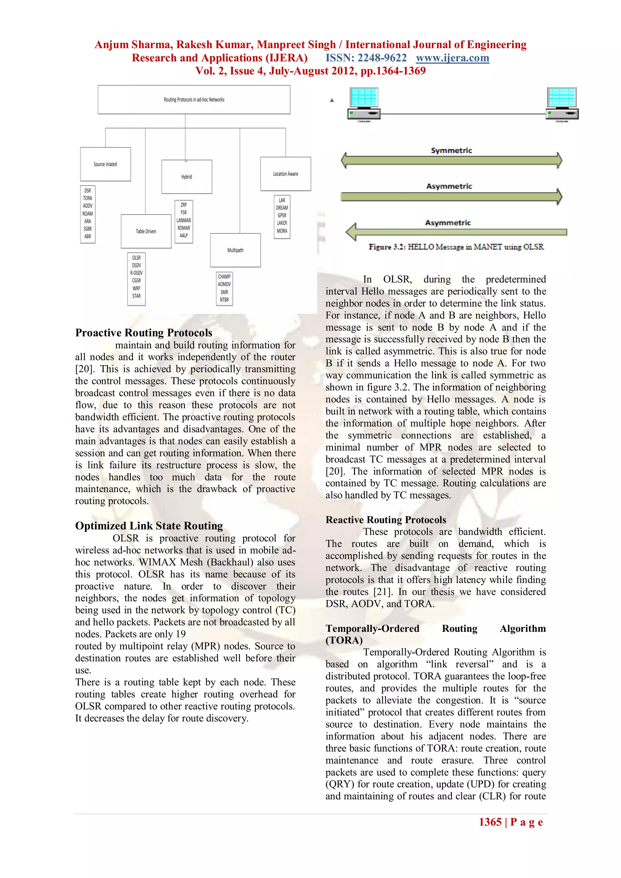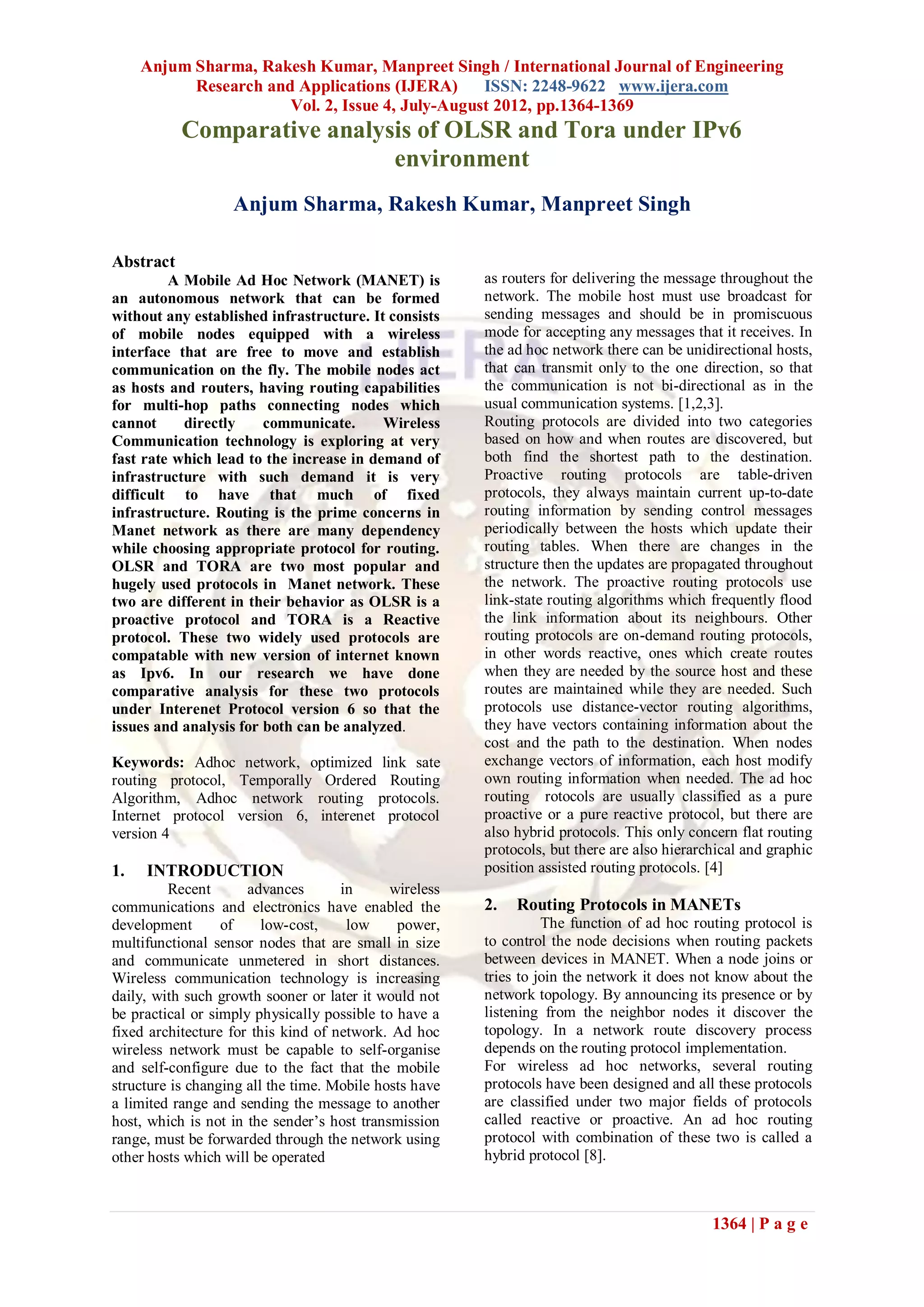 The document explores a comparative analysis of the Optimized Link State Routing (OLSR) and Temporally Ordered Routing Algorithm (TORA) in mobile ad hoc networks (MANETs) specifically under IPv6 environments. It discusses the protocols' characteristics, advantages, and disadvantages, highlighting OLSR's efficiency in maintaining routing information proactively compared to TORA's reactive approach. Additionally, the paper evaluates performance metrics such as network load, throughput, and end-to-end delay, demonstrating that OLSR outperforms TORA in various scenarios within the IPv6 context.
