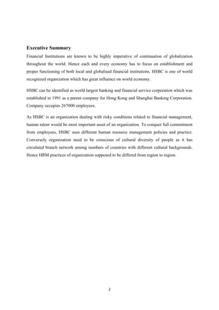 HSBC is a global banking and financial services company established in 1991 with over 267,000 employees worldwide. As an organization dealing with financial risks, human talent is its most important asset. To gain full employee commitment, HSBC uses different human resource management policies and practices tailored to different cultural contexts. In East Asia, HSBC faces challenges recruiting local skilled talent and uses an international talent management process to identify and develop future leaders internally. Training programs are designed regionally but implemented locally considering cultural differences to enhance employee performance and prepare them for future roles.