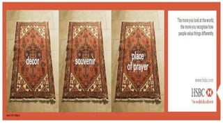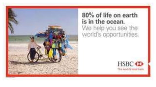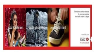HSBC's marketing campaigns highlight its global outlook and respect for diverse cultures and values. Its slogan acknowledges local knowledge while connecting to a worldwide business. A video campaign illustrates how people can have different perspectives and priorities. HSBC recognizes cultural differences and that individuals value things uniquely. The bank aims to understand each customer to best serve their needs.