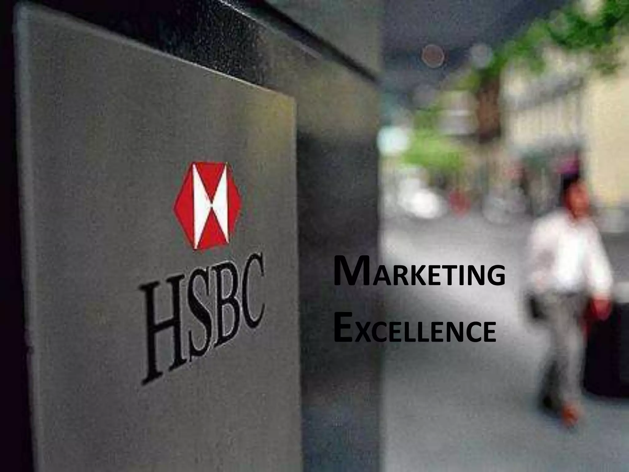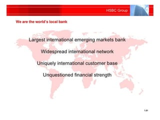 HSBC is the world's second largest bank by assets and operates in over 70 countries. It has a global presence and markets itself as the "World's Local Bank" by targeting customers around the globe. HSBC uses market segmentation to identify and target niche markets. Some of its marketing strategies include print ads, establishing in new markets through campaigns, and identifying fast growing areas like pet insurance in Hong Kong. While this global positioning allows HSBC to access a huge potential customer base, it also presents management challenges to cater to different customer groups worldwide.