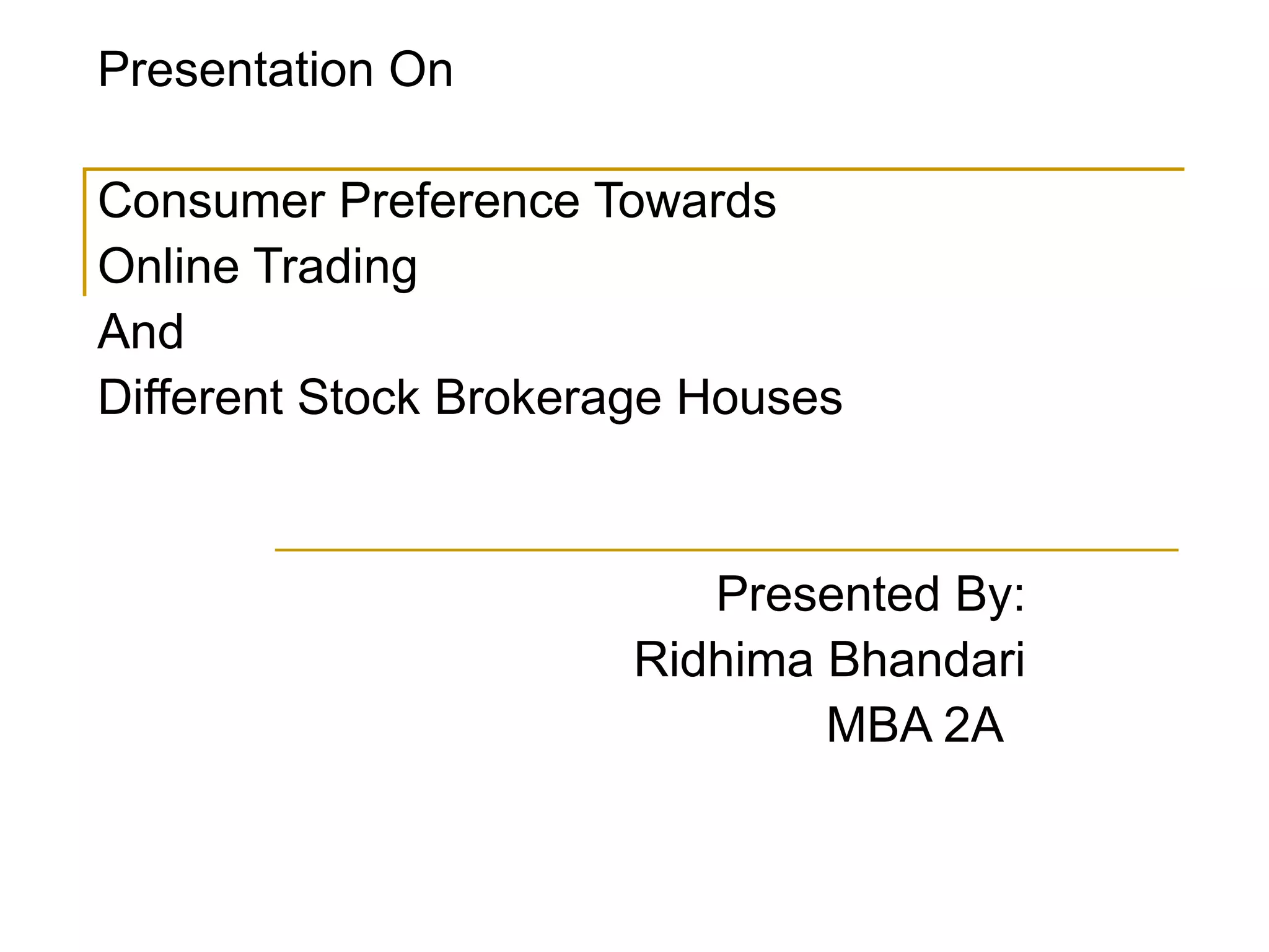 This document provides an overview of HSBC InvestDirect, an online stock brokerage firm in India. It discusses HSBC's history and international presence. It then focuses on HSBC InvestDirect, describing its products, services, locations in India, and competitive positioning compared to other brokerage houses. Key facts presented include brokerage fees, account opening charges, and annual maintenance fees for HSBC InvestDirect and other major brokers.