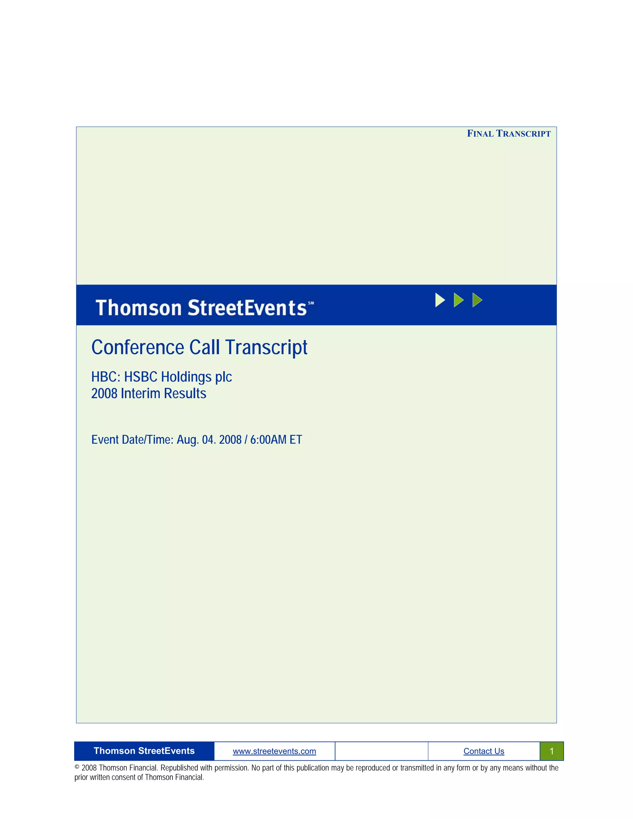 This document contains the transcript from a conference call held by HSBC Holdings plc to discuss their 2008 interim results. The call was led by Group Chairman Stephen Green who provided an overview of the financial headlines and performance. Group Finance Director Douglas Flint then discussed the financial results in more detail, including revenue, expenses, loan impairment charges, capital ratios, and exposures in Global Banking and Markets. Group Chief Executive Michael Geoghegan then discussed the company's progress on key metrics and performance across different regions.