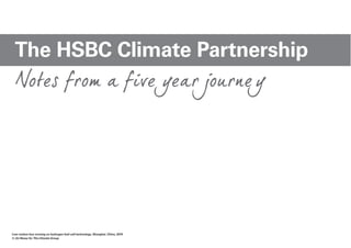 The HSBC Climate Partnership was a 5-year, $100 million program involving over 100,000 people. It worked with environmental organizations on projects around the world that protected forests, improved access to water for 32 million people, and helped 10 cities reduce carbon emissions. The partnership trained over 2,000 HSBC employees as climate champions to educate others and implement sustainability projects. It achieved significant environmental impacts and engaged many HSBC employees in its work.
