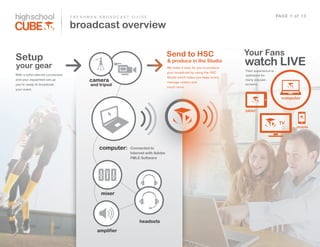 This document provides guidance for broadcasting a high school event using video and audio equipment. It includes: