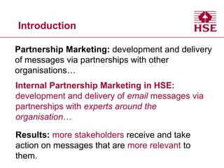 This document discusses internal partnership marketing at the UK's Health and Safety Executive (HSE). It describes how HSE develops email messages via partnerships with experts within the organization to more effectively reach stakeholders with relevant safety information. Two case studies are provided that show how partnership marketing for announcements about changes to injury reporting requirements and a trainee inspector campaign led to thousands of additional visits to HSE websites and helped meet recruitment goals. The conclusions emphasize that obtaining buy-in for partnerships is challenging but encourages seeing the "bigger picture" and that reporting results demonstrates the value of this approach over acting alone.