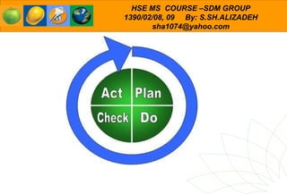 طرح ریزی : ایجاد اهداف کلان و فرآیند های مرتبط با خط مشی HSE سازمان . اجرا : استقرار فرآیندها بررسی : پایش و اندازه گیری فرآیند های مرتبط با خط مشی HSE ، اهداف کلان، الزامات قانونی و دیگر الزامات و گزارش نتایج . اقدام اصلاحی : انجام اقدامات به منظور بهبود مستمر در عملکرد سیستم مدیریت HSE