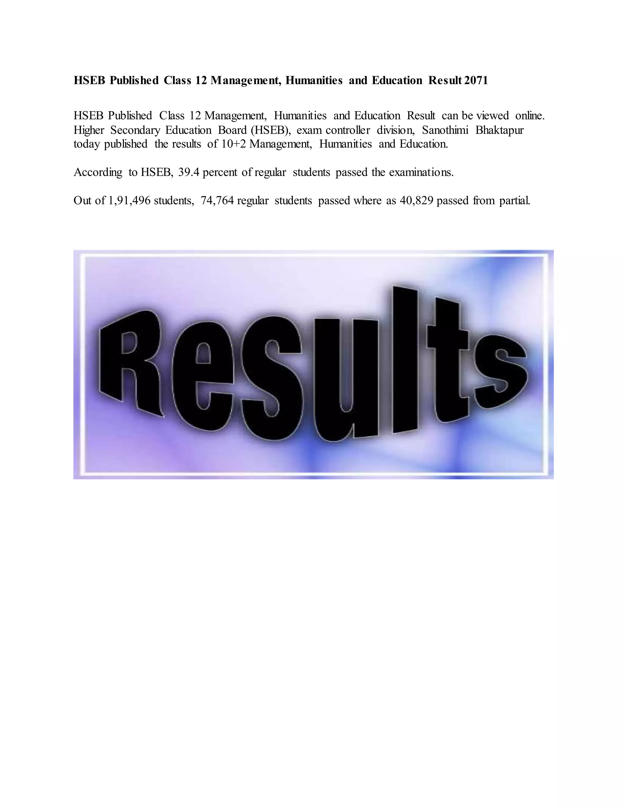 HSEB published the results of Class 12 Management, Humanities and Education exams, with 39.4% of regular students passing. The Higher Secondary Education Board released the results online, showing that out of over 191,000 students who sat for the exams, 74,764 regular students and 40,829 partial students passed.