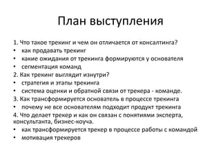 Документ описывает программу трекинга для основателей стартапов, включая ключевые аспекты, такие как различия между трекингом и консалтингом, ожидания и трансформацию участников. Также рассматриваются стратегии достижения финансовых целей, диагностика текущего состояния команд и пути поддержки их развития. Важным элементом является сегментация команд по уровню опыта и формирование индивидуального подхода к каждому сегменту.