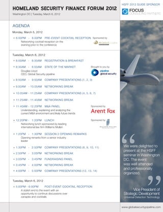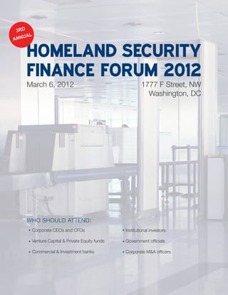 This document provides information about the Homeland Security Finance Forum 2012 conference, including the agenda, past attendees, and details about the event. The conference will take place on March 6, 2012 in Washington DC and will feature company presentations, panels on M&A trends and fundraising, and networking opportunities. It is intended for senior executives, investors, and government officials in the homeland security industry.