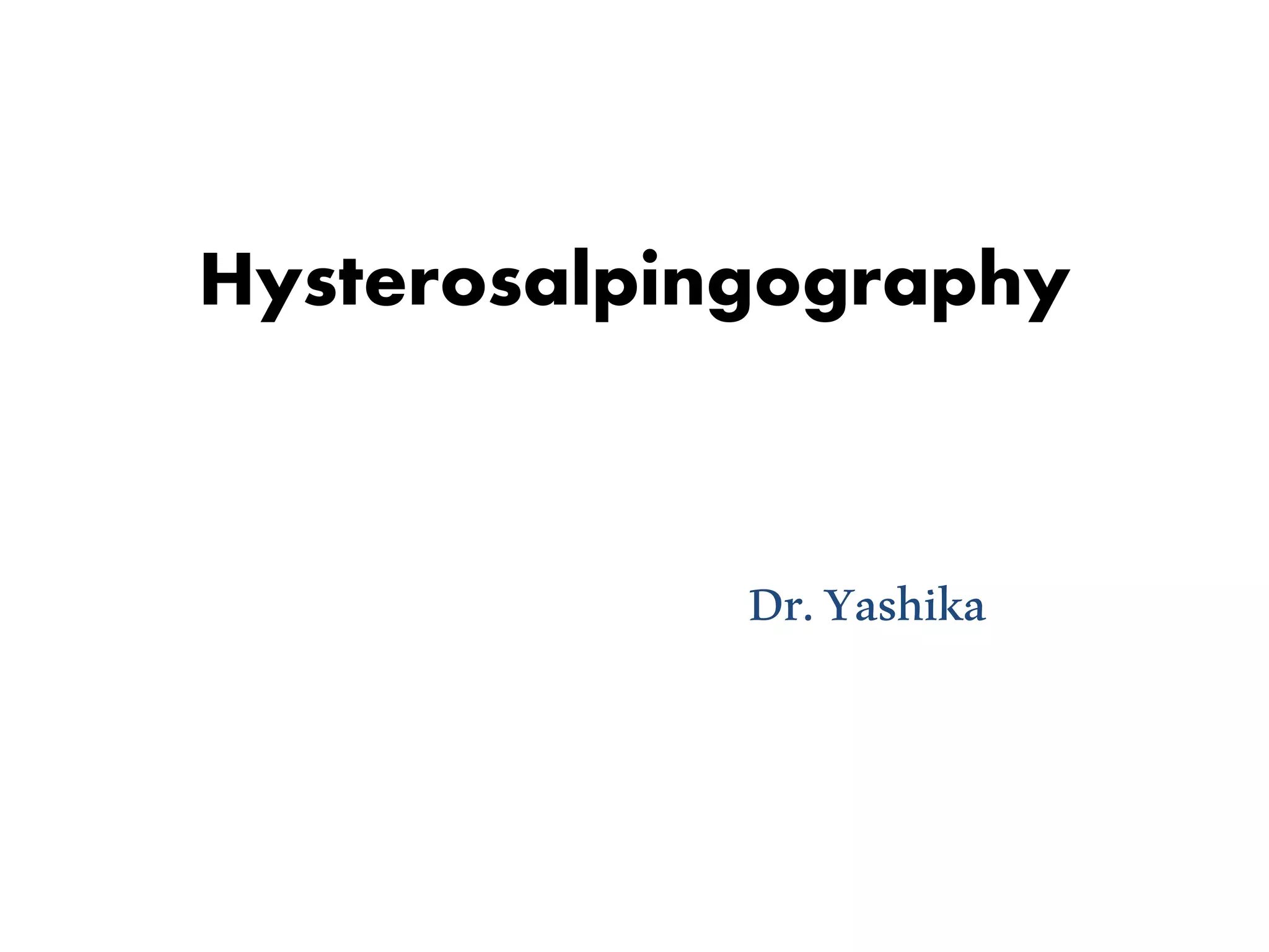 Hysterosalpingography (HSG) is a radiological procedure used to examine the uterine cavity and the patency of fallopian tubes using a fluorescent dye. It is indicated for various diagnoses including uterine malformations, cervical incompetence, and abdominal pregnancy. The procedure involves several steps, requires a patient to have an empty bladder, and may lead to complications such as pelvic pain and infection.