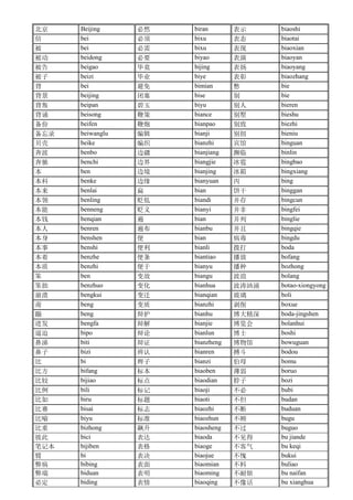 outu 批评 piping 能量 nengliang P 批准 pizhun 能源 nengyuan 趴 pa 疲惫 pibei 嗯 ng 爬山 pashan 疲倦 pijuan 你 ni 拍 pai 疲劳 pilao 拟定 niding 排斥 paichi 皮肤 pifu 年 nian 排除 paichu 皮革 pige 年代 niandai 排队 paidui 皮鞋 pixie 年度 niandu 排放 paifang 啤酒 pijiu 年级 nianji 排列 pailie 脾气 piqi 年纪 nianji 排球 paiqiu 匹 pi 年龄 nianling 徘徊 paihuai 屁股 pigu 年轻 nianqing 派 pai 譬如 piru 念 nian 派别 paibie 篇 pian 鸟 niao 派遣 paiqian 偏差 piancha 捏 nie 攀登 pandeng 偏见 pianjian 您 nin 盘旋 panxuan 偏僻 pianpi 拧 ning 盘子 panzi 偏偏 pianpian 凝固 ninggu 畔 pan 便宜 pianyi 凝聚 ningju 判断 panduan 骗 pian 凝视 ningshi 判决 panjue 片 pian 宁可 ningke 盼望 panwang 片断 pianduan 宁肯 ningken 旁边 pangbian 片刻 pianke 宁愿 ningyuan 庞大 pangda 片面 pianmian 牛奶 niunai 胖 pang 飘 piao 牛仔裤 niuzaiku 抛弃 paoqi 飘扬 piaoyang 纽扣儿 niukour 跑步 paobu 漂浮 piaofu 扭转 niuzhuan 泡沫 paomo 票 piao 浓 nong 陪 pei 漂亮 piaoliang 浓厚 nonghou 赔偿 peichang 拼搏 pinbo 农村 nongcun 培训 peixun 拼命 pinming 农历 nongli 培养 peiyang 频道 pindao 农民 nongmin 培育 peiyu 频繁 pinfan 农业 nongye 配备 peibei 频率 pinlu 弄 nong 配合 peihe 贫乏 pinfa 奴隶 nuli 配偶 pei’ou 贫困 pinkun 努力 nuli 配套 peitao 品尝 pinchang 暖和 nuanhuo 佩服 peifu 品德 pinde 挪 nuo 盆 pen 品行 pinxinjg 女儿 nu’er 盆地 pendi 品质 pinzhi 女人 nuren 烹饪 pengren 品种 pinzhong 女士 nushi 朋友 pengyou 乒乓球 pingpangqiu 虐待 nuedai 捧 peng 凭 ping O 碰见 pengjian 平 ping 哦 o 披 pi 平常 pingchang 殴打 ouda 劈 pi 平等 pingdeng 欧洲 Ouzhou 批 pi 平凡 pingfan 偶尔 ou’er 批发 pifa 平方 pingfang 偶然 ouran 批判 pipan 平衡 pingheng