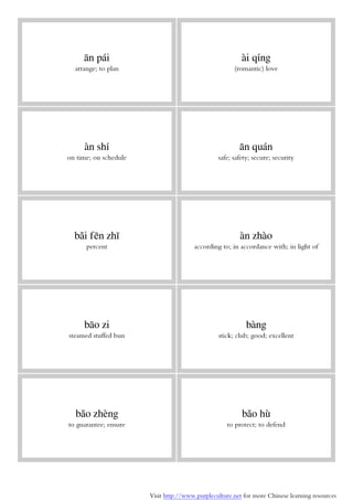 The document consists of vocabulary and phrases in Chinese, covering various topics such as emotions, actions, professions, locations, and much more. Each entry includes the Chinese term, its pinyin transcription, and its English translation. Additionally, it provides links to more resources for Chinese learning.