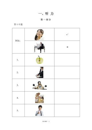 水 平 考 试 HSK(一级) H11005 注 意 一、HSK(一级)分两部分: 1.听力(20 题,约 15 分钟) 2.阅读(20 题,17 分钟) 二、听力结束后,有 3 分钟填写答题卡。 三、全部考试约 40 分钟(含考生填写个人信息时间 5 分钟)。 中国 北京 国家汉办/孔子学院总部 编制