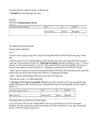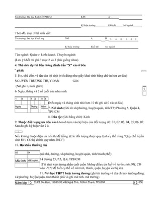 Tài liệu hướng dẫn thí sinh làm hồ sơ đăng ký dự thi với các bước cụ thể như điền thông tin về trường thi, ngành học và thông tin cá nhân. Thí sinh cần chú ý các điều kiện và quy định liên quan đến việc đăng ký học tại các trường đại học và cao đẳng, bao gồm thông tin về đối tượng ưu tiên và vùng miền. Hồ sơ hoàn tất bao gồm các giấy tờ cần thiết như ảnh chân dung, phong bì và bản sao giấy chứng nhận hợp pháp nếu thuộc diện ưu tiên.