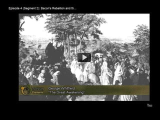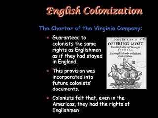 European migrations to the Americas in the 17th century were driven by promises of land and rights as English subjects. The Jamestown colony struggled at first due to disease, lack of food, and gold seeking instead of farming. Tobacco eventually made the colony prosperous. Indentured servitude and headrights were used to attract laborers, while slavery gradually replaced indentured servants and the slave trade grew dramatically. Bacon's Rebellion in 1676 exposed class tensions between elites and landless colonists.