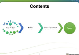 The document presents an image enhancement technique that leverages the Retinex theory applied in the HSV color space with saturation correction. It discusses various methods, including multi-scale Retinex (MSR), and compares the processing times of the proposed approach with existing methods. Results indicate improved performance in terms of speed without compromising image quality.