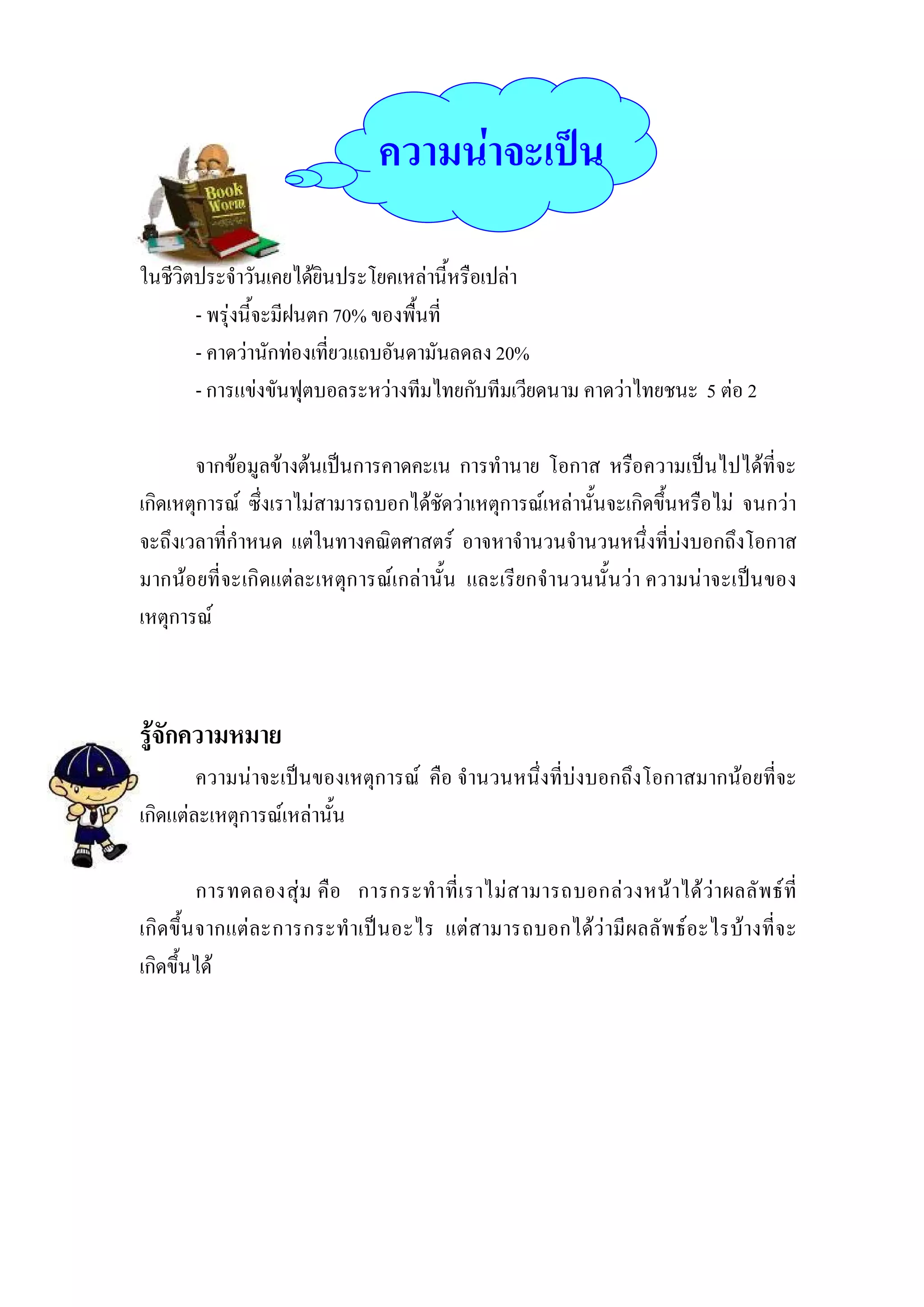- พรุงนี้จะมีฝนตก 70% ของพื้นที่ - คาดวานักทองเที่ยวแถบอันดามันลดลง 20% - การแขงขันฟุตบอลระหวางทีมไทยกับทีมเวียดนาม คาดวาไทยชนะ 5 ตอ 2 จากขอมูลขางตนเปนการคาดคะเน การทํานาย โอกาส หรือความเปนไปไดที่จะ เกิดเหตุการณ ซึ่งเราไมสามารถบอกไดชัดวาเหตุการณเหลานั้นจะเกิดขึ้นหรือไม จนกวา จะถึงเวลาที่กําหนด แตในทางคณิตศาสตร อาจหาจํานวนจํานวนหนึ่งที่บงบอกถึงโอกาส มากนอ ยที่จะเกิ ดแตละเหตุก ารณเ กลานั้น และเรียกจํานวนนั้นวา ความนาจะเปน ของ เหตุการณ รูจักความหมาย ความนาจะเปนของเหตุการณ คือ จํานวนหนึ่งที่บงบอกถึงโอกาสมากนอยที่จะ เกิดแตละเหตุการณเหลานั้น การทดลองสุม คือ การกระทํ า ที่ เ ราไมส ามารถบอกลว งหน าได วา ผลลั พธ ที่ เกิ ดขึ้น จากแตล ะการกระทําเปน อะไร แตสามารถบอกไดวามีผลลั พธอ ะไรบางที่ จ ะ เกิดขึ้นได