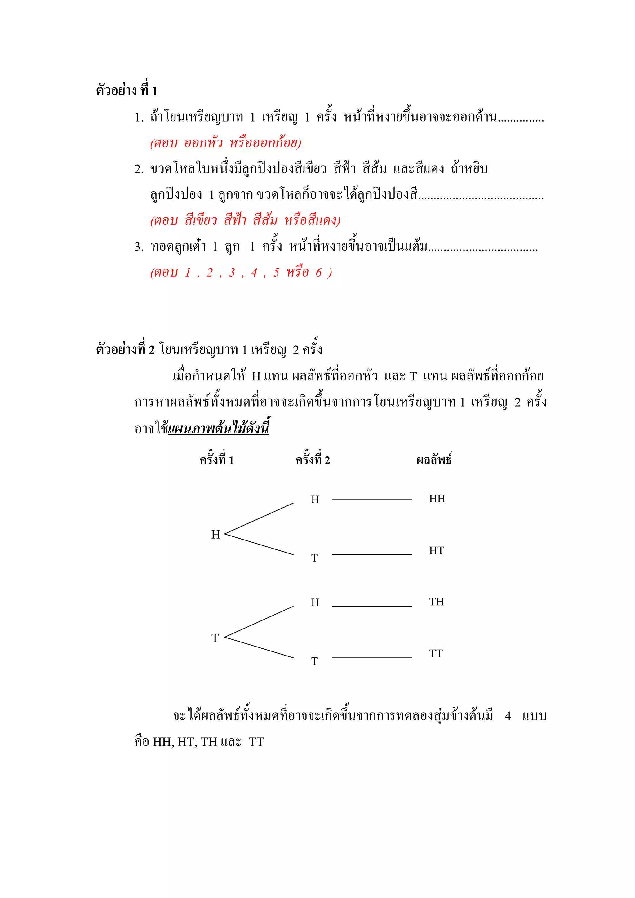 1. ถาโยนเหรียญบาท 1 เหรียญ 1 ครั้ง หนาที่หงายขึ้นอาจจะออกดาน............... (ตอบ ออกหัว หรือออกกอย) 2. ขวดโหลใบหนึงมีลูกปงปองสีเขียว สีฟา สีสม และสีแดง ถาหยิบ ่ ลูกปงปอง 1 ลูกจาก ขวดโหลก็อาจจะไดลูกปงปองสี........................................ (ตอบ สีเขียว สีฟา สีสม หรือสีแดง) 3. ทอดลูกเตา 1 ลูก 1 ครั้ง หนาที่หงายขึนอาจเปนแตม................................... ้ (ตอบ 1 , 2 , 3 , 4 , 5 หรือ 6 ) ตัวอยางที่ 2 โยนเหรียญบาท 1 เหรียญ 2 ครั้ง เมื่อกําหนดให H แทน ผลลัพธที่ออกหัว และ T แทน ผลลัพธที่ออกกอย การหาผลลัพธทั้งหมดที่อาจจะเกิดขึ้นจากการโยนเหรียญบาท 1 เหรียญ 2 ครั้ง อาจใชแผนภาพตนไมดังนี้ ครั้งที่ 1 ครั้งที่ 2 ผลลัพธ H HH H T HT H TH T T TT จะไดผลลัพธทงหมดทีอาจจะเกิดขึนจากการทดลองสุมขางตนมี 4 แบบ ั้ ่ ้ คือ HH, HT, TH และ TT